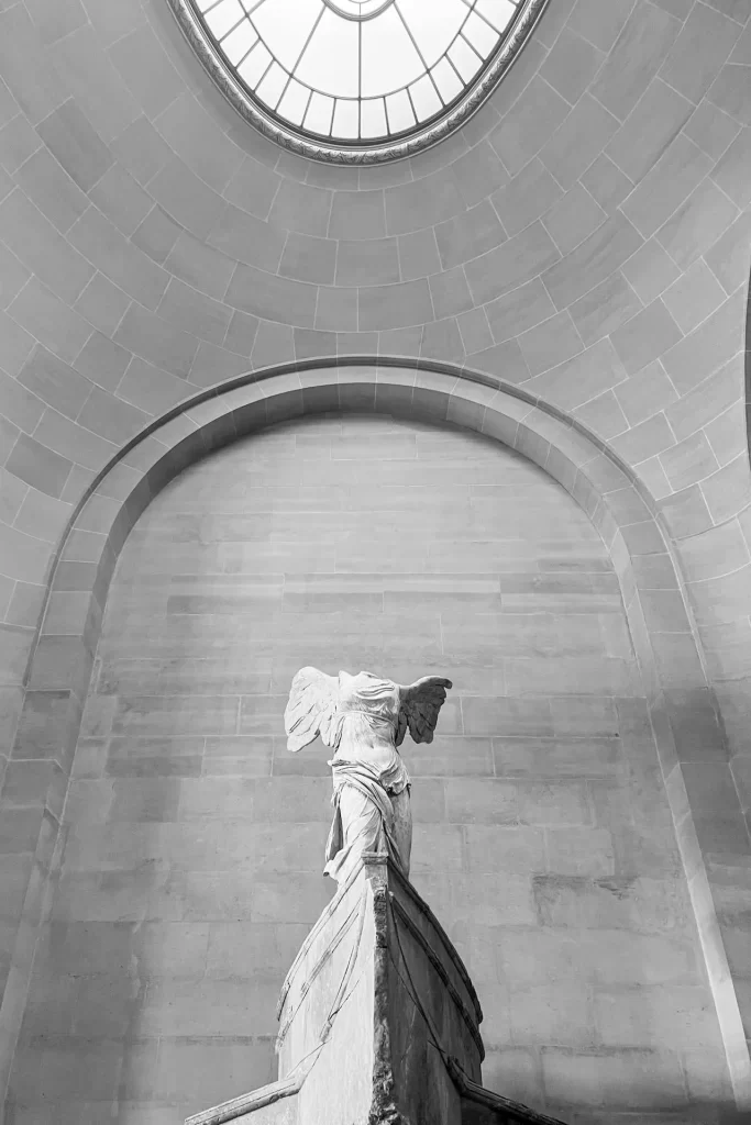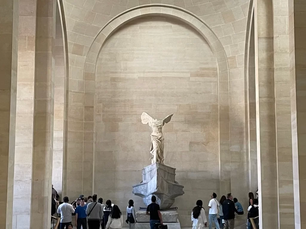 ルーヴル美術館の大階段に立つサモトラケのニケ。頭がなくても、その美しさと迫力は今も多くの人を魅了し続けています。これから、サモトラケのニケの話を詳しくしましょう!🙆♂️